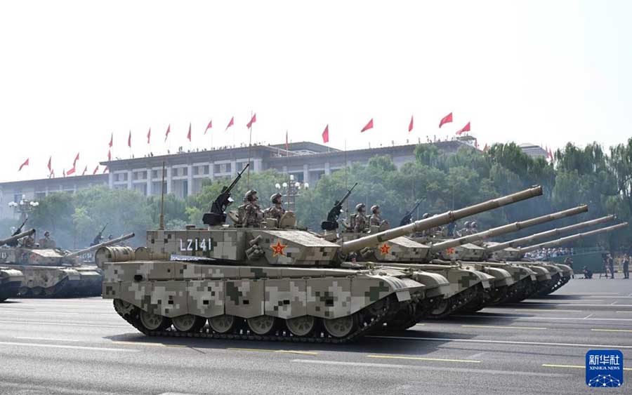 地面突击方队的22辆战车呈“箭”形排列,3日通过天安门广场,接受祖国和人民检阅。作为陆军地面突击力量的新一代装甲装备,受阅的99B坦克、100坦克、100支援战车,尽显机动夺要、攻坚突破的强大战力,是我军高技术装备体系的重要组成部分。99B坦克在99A坦克的基础上通过技术融合和功能扩展,大幅提升信息化条件下一体化联合作战、多元目标火力打击、复杂地域环境机动和恶劣天候下乘员持续作战能力。100坦克以及100支援战车,能够遂行远程快速部署、战役目标夺控、战术纵深突击、城市攻防作战、联合火力引导等作战任务。