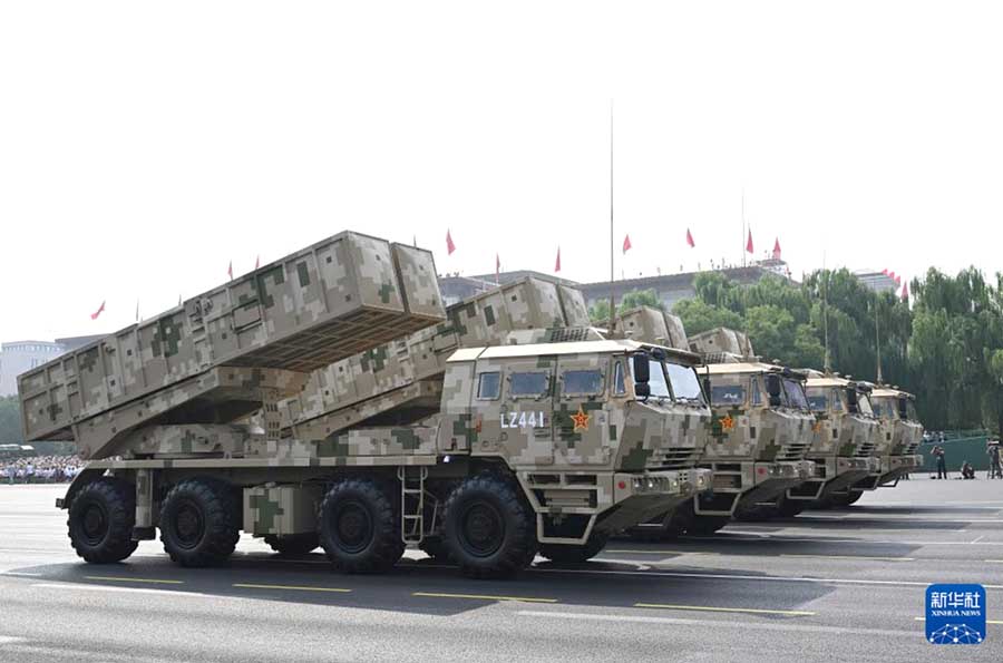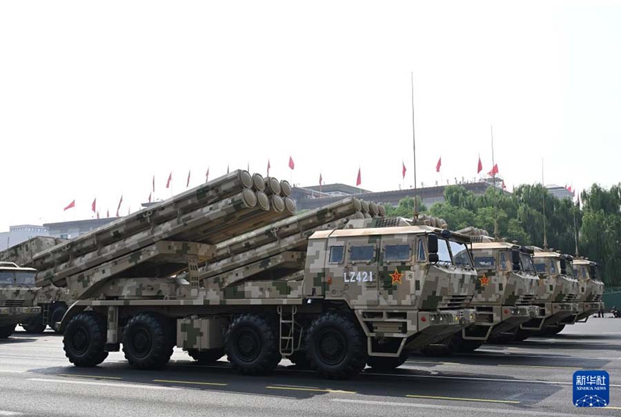 远程压制,精确打击。远程火炮方队3日上午接受检阅,在2台引导车的引导下,16台191远程箱式火箭炮通过天安门广场。这次亮相的两型191远程箱式火箭炮,具有射程远、精度高、反应速度快、火力体系广、点面结合等特点,特别是箱式弹药补充方式能大幅缩短作战准备时间。它们集战役打击、战术支援为一体,可远程压制歼敌、精确打击破敌,深度拓展陆战能力新边界,尽显陆军长剑锋芒。