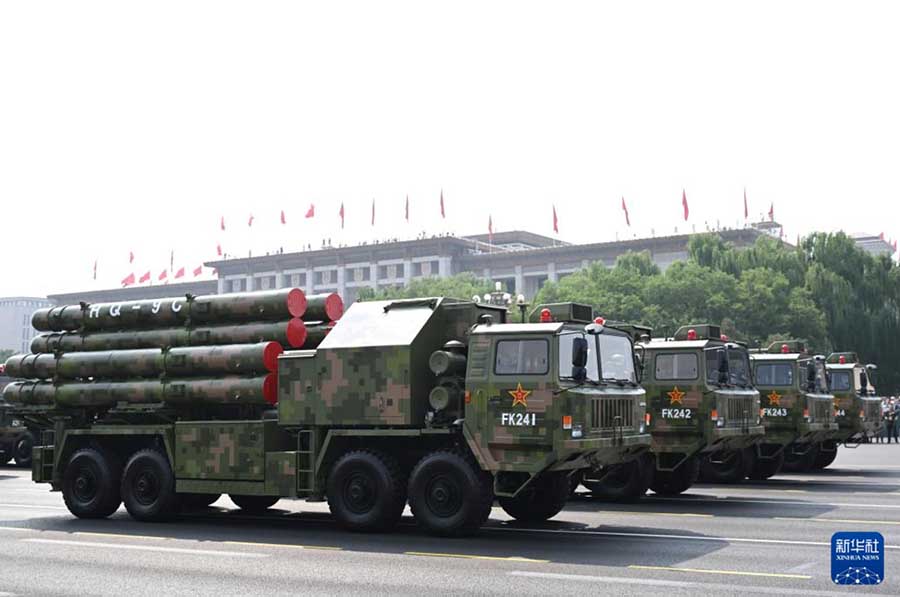 剑指苍穹,御敌长空。对空抗击方队3日上午经过天安门广场,接受祖国和人民检阅。受阅的红旗-20、红旗-19、红旗-29等6型装备,全部由我国自主研制设计生产,可实施多段多层反导拦截,主要用于拦截直升机、飞机、导弹等目标,远中近程防空抗击,全时待战应对空天威胁,构筑起防空御天的坚固屏障。目前,空军地空导弹部队已经形成了远中近程、高中低空相结合的作战体系,具备全天候、全方位打击能力。