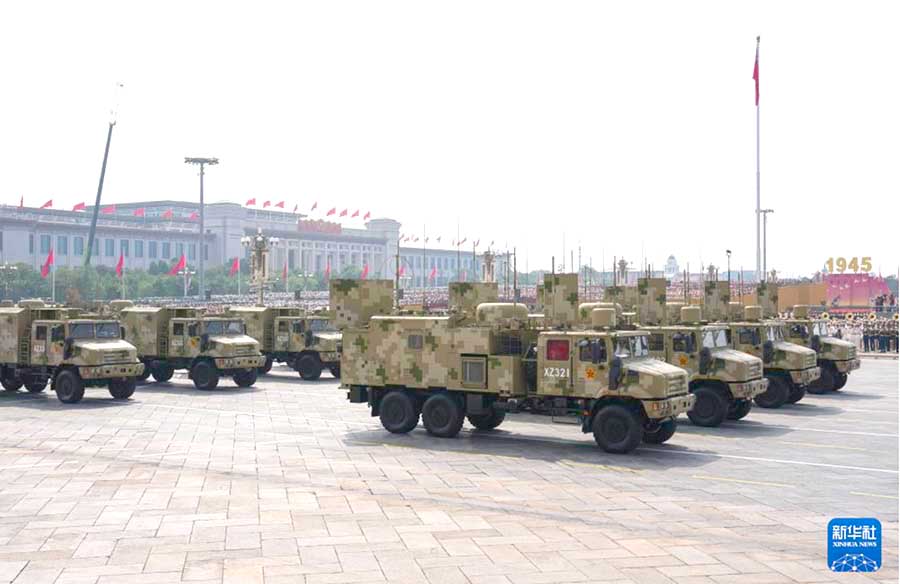 电子对抗方队3日上午经过天安门广场,接受祖国和人民检阅。受阅的5型电子对抗骨干装备,能够全频侦控、精准压制,具备空天防抗、破网断链作战能力,是制胜多域联合战场的利器。这些受阅装备均为我军自主研发,是我军现役电子对抗主战装备,形成了“侦、攻、防”三位一体电子战能力,是抢占战场先机的“电磁利剑”。
